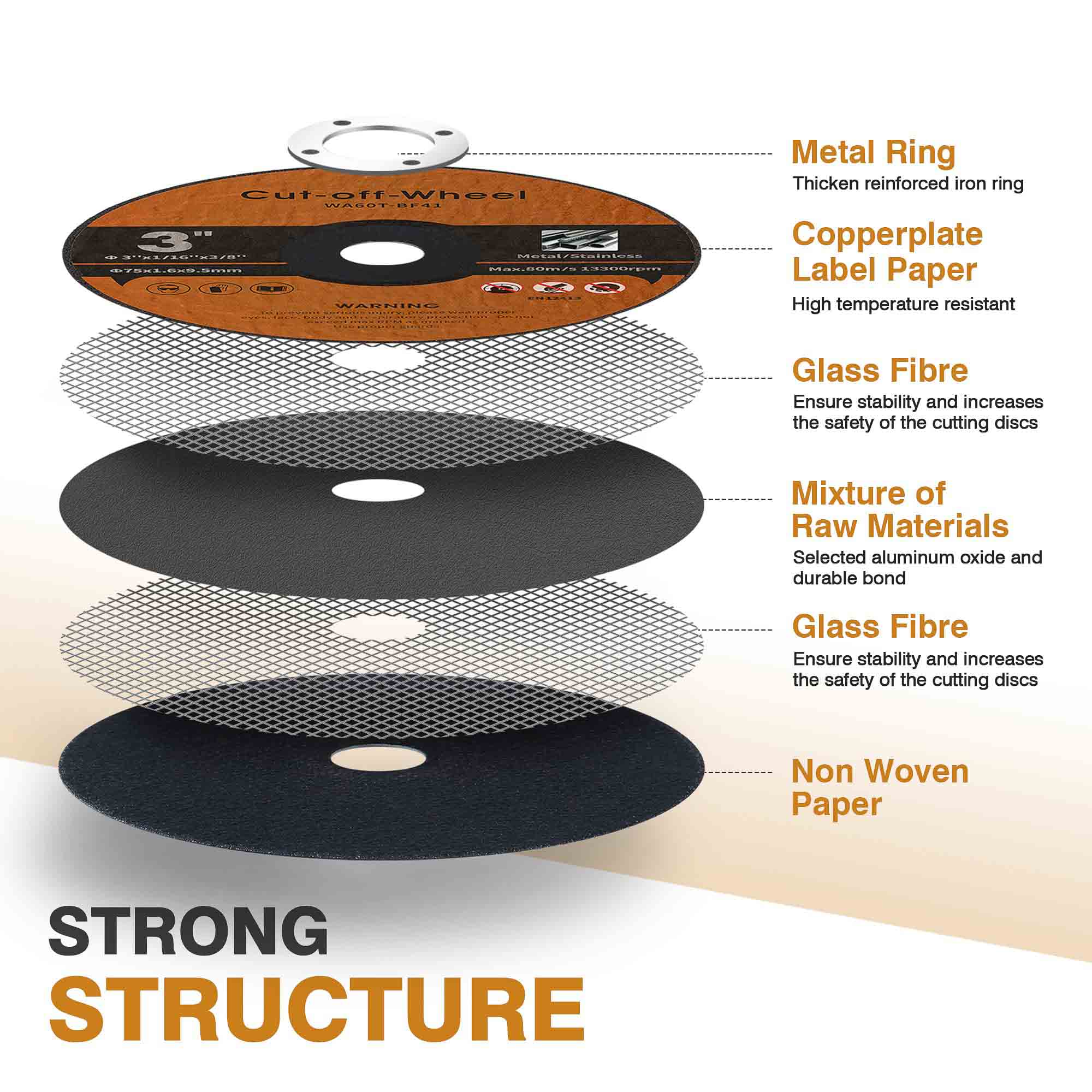 แกนตาข่ายไฟเบอร์กลาสสองชั้นให้: ความต้านทานการฉีกขาด 360 °ในระหว่างการทำงานรอบต่อนาทีสูงการป้องกันการระเบิดภายใต้ภาระหนัก